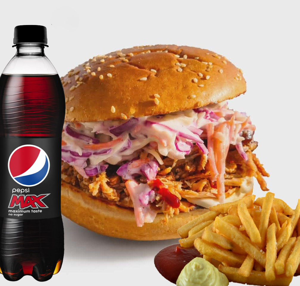 Brioche bolle smurt med mayo, saftig pulled pork og sprød coleslaw samt valgfri 0,5 sodavand og pommes